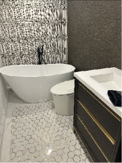OUT with the old 12 x 12 ceramic tiles and IN with new 24 x 48 porcelain tiles. No more grout to clean ! And we put under floor heating in to keep the toes warm all year long ! |