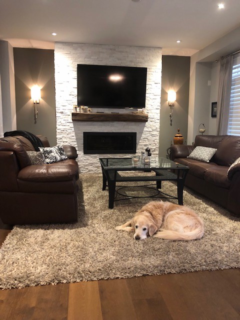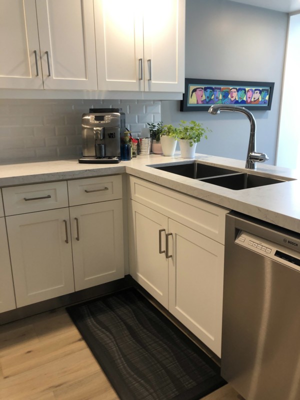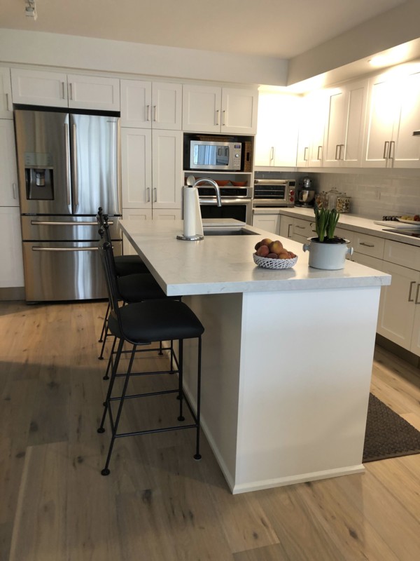 OUT with the old 12 x 12 ceramic tiles and IN with new 24 x 48 porcelain tiles. No more grout to clean ! And we put under floor heating in to keep the toes warm all year long ! |